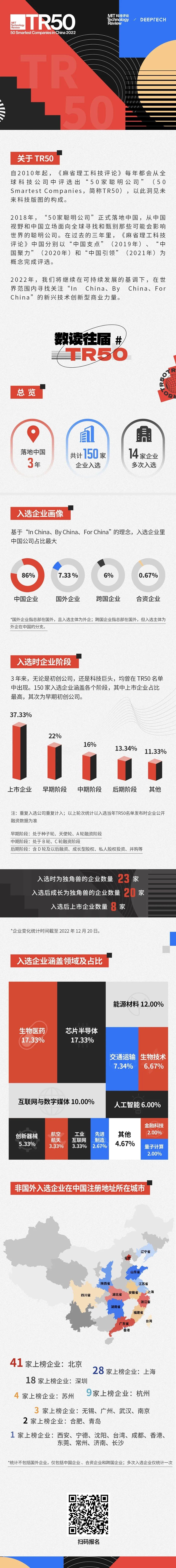 此外,在入选 TR50 后,这些企业都有或大或小(与入选时间相关)的成长。据统计,以独角兽级别入选当年 TR50 的企业共有 23 家;截至 2022 年 12 月 20 日,新晋独角兽的企业共 20 家,实现成功上市企业为 8 家。