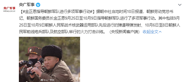 据朝中社10日报道,金正恩9月25日至10月9日指导朝鲜军队进行了多项军事行动。其中包括9月25日至10月9日朝鲜人民军战术核武器运用部队先后进行的弹道导弹发射、10月6日至8日朝鲜人民军前线炮兵部队及航空部队举行的火力打击训练。