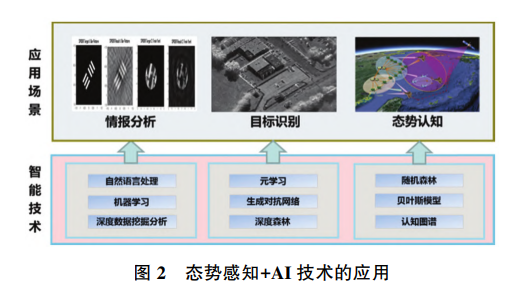 在探测感知领域,主要可在目标信息获取、战场 数据分析等方面应用自然语言处理、元学习、随机森 林等职能技术,实现信息优势,如图 2 所示。