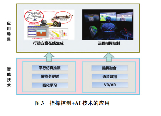 在指挥控制领域,主要可在作战方案推演、远程 指挥控制等方面应用平行仿真推演、脑机融合等智 能技术,实现决策优势,如图 3 所示。