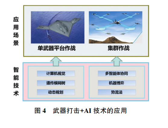 在武器打击领域,主要可在单武器平台自主作 战、作战编组分布式杀伤等方面应用计算机视觉、多 智能体协同等智能技术, 实现力量优势, 如图 4 所示。