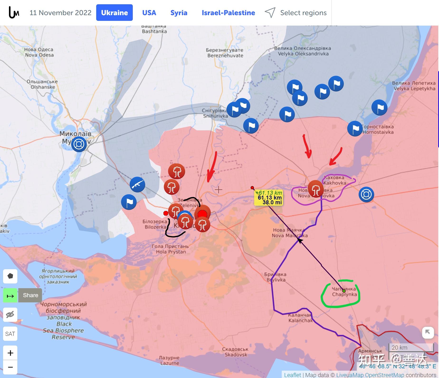 上图绿色圈内的Chaplynka据称是俄军赫尔松总指挥部的位置。这里有一个军用机场,是K-52对河右岸俄军进行支援的前进基地。随着俄军撤离右岸,海玛斯已经可以威胁到这个位置。