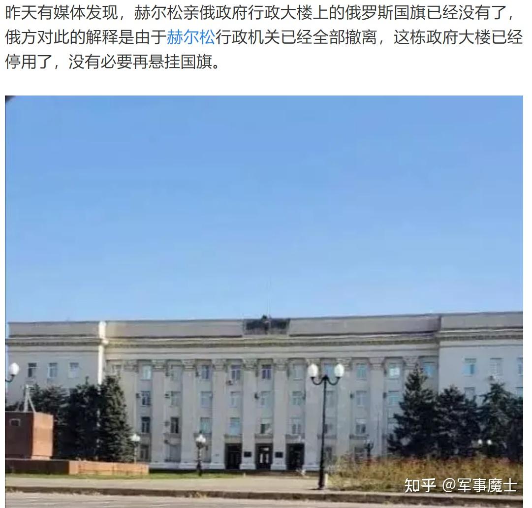11月3日,赫尔松市政府的门前国旗不见了,俄罗斯的行政体系在那个时候也已经撤退了。直到11月9日宣布撤军的时候,赫尔松西部只剩下俄军和不愿意走的当地居民。