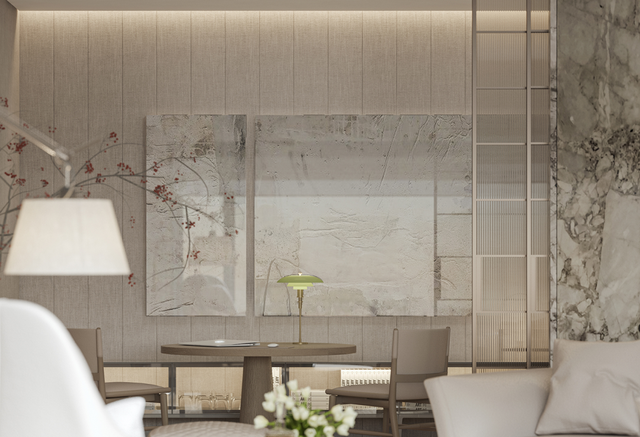 A户型为两个卧室加客餐厅户型,是4个户型中面积最小的,但却有着独享的私家电梯。DIA着力于以居住者视角打造个人或小家庭独属私密空间。追求自然材质表现与功能空间的交叠运用,以及空间真实的自我情感提升。