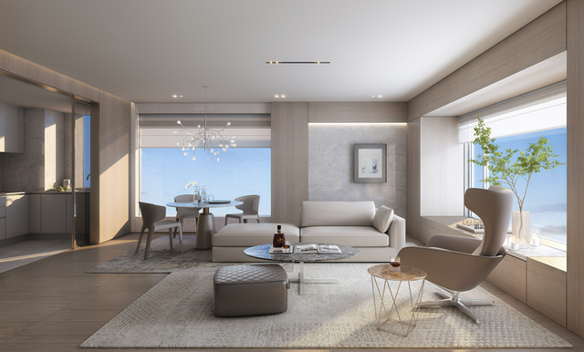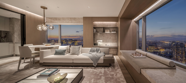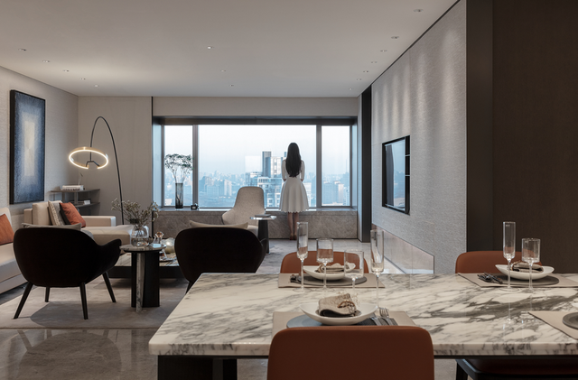 70㎡的会客厅,8.1m超大面宽,270°观景角度。远眺是CBD的繁华景观,低头是亮马河边的葱郁景色。沙发、茶几都是国际大牌,灯光氛围由亚洲知名设计师设计,满足每个居家时刻的氛围感。