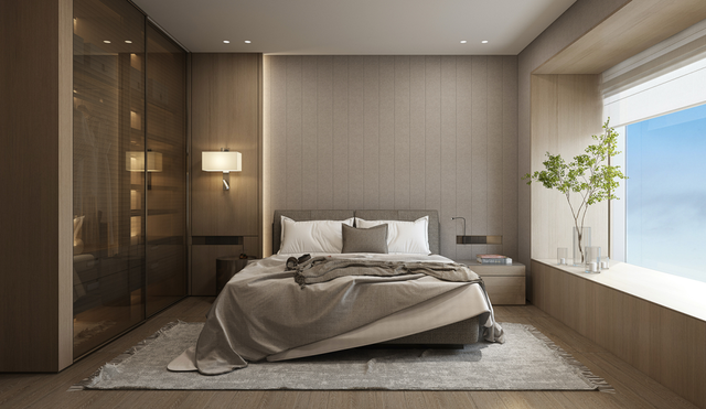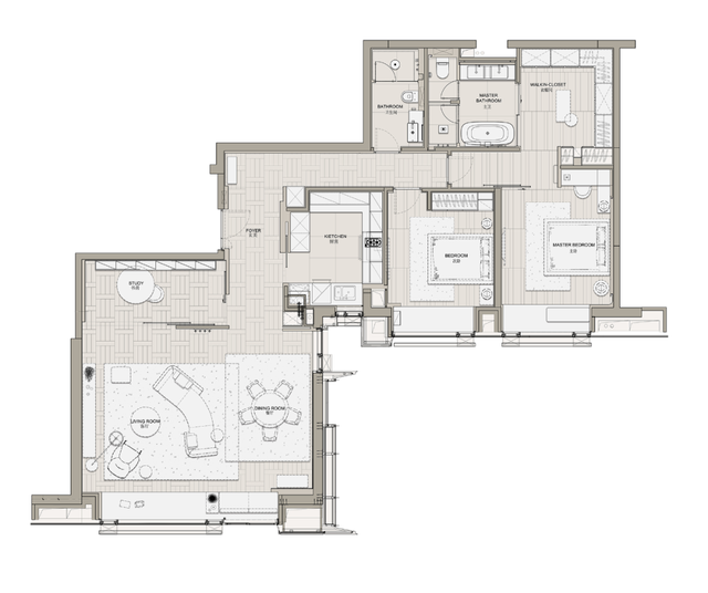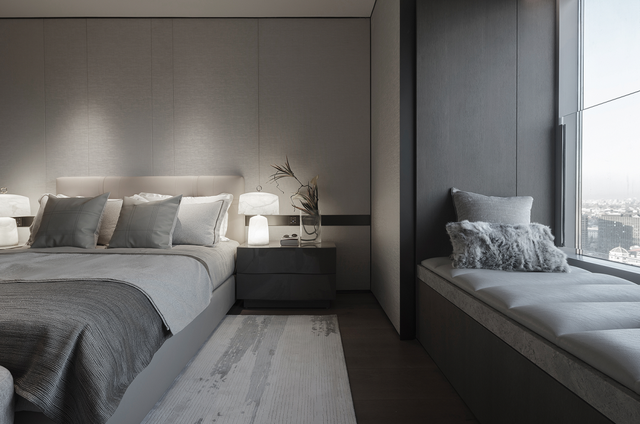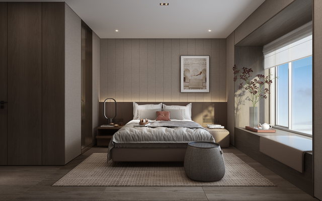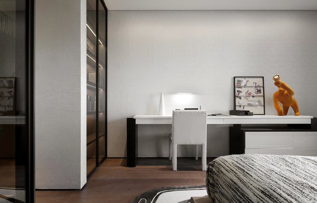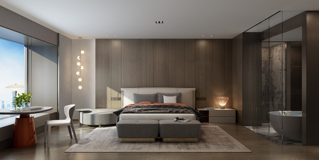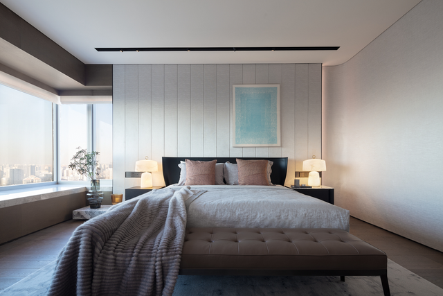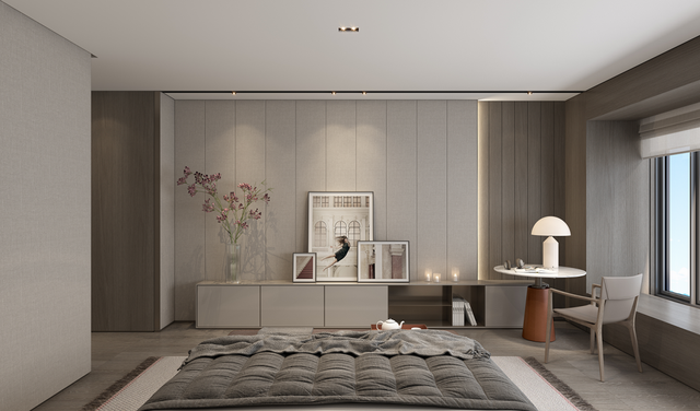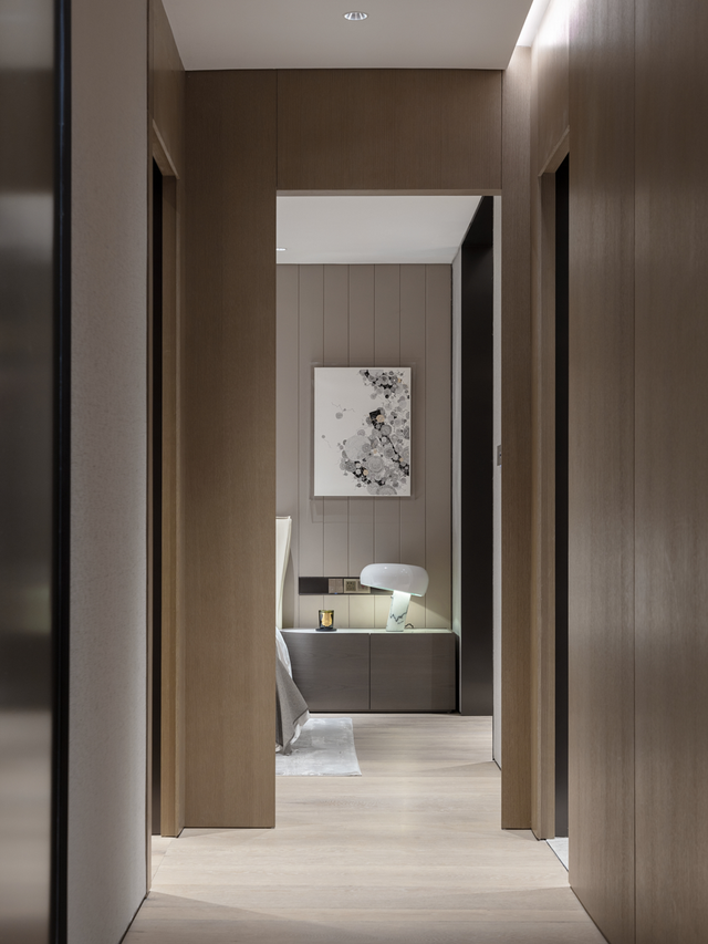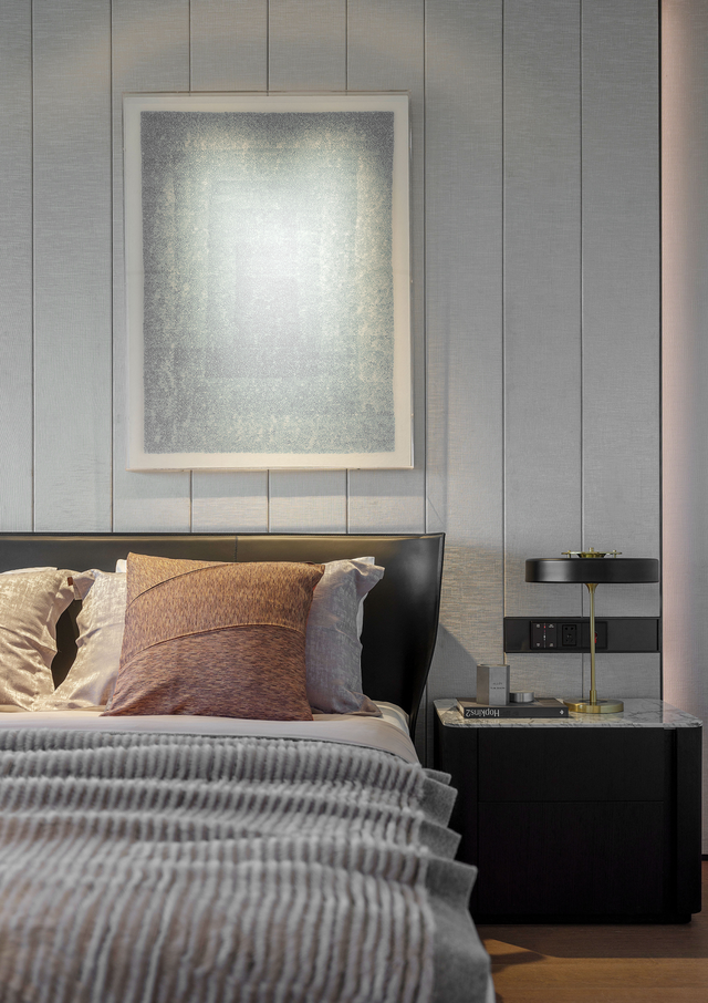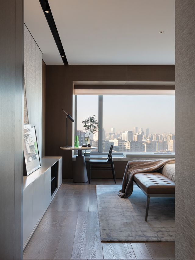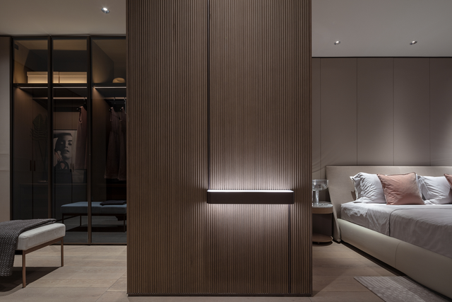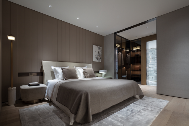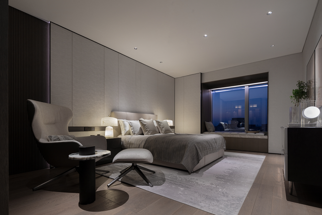 从生活区逐渐切换到私人房间,家具及材质的衔接温和地引导着人们情绪,揭示着空间功能及使用场景的变化。这种引导性呈现出根本的、更为持久的生命力与美学特征。由观景飘窗、步入式衣帽间、独立卫浴组成的全功能主卧,套房的设计诠释私密有度的奢适之境。