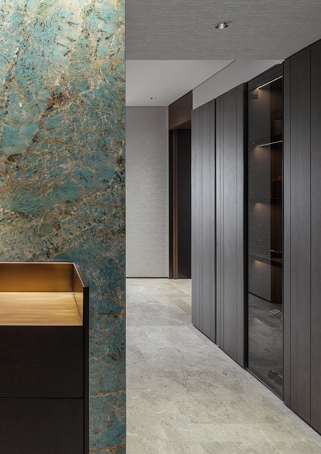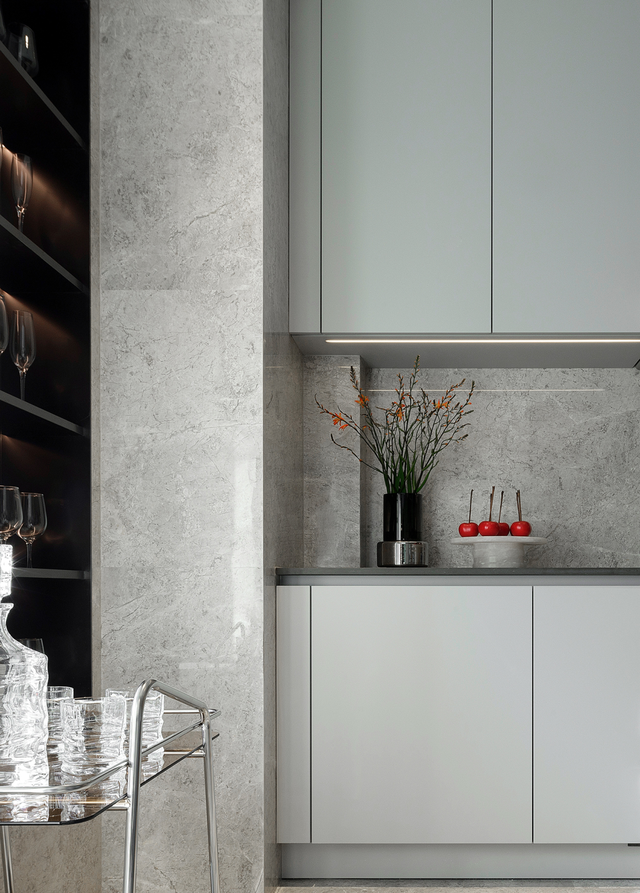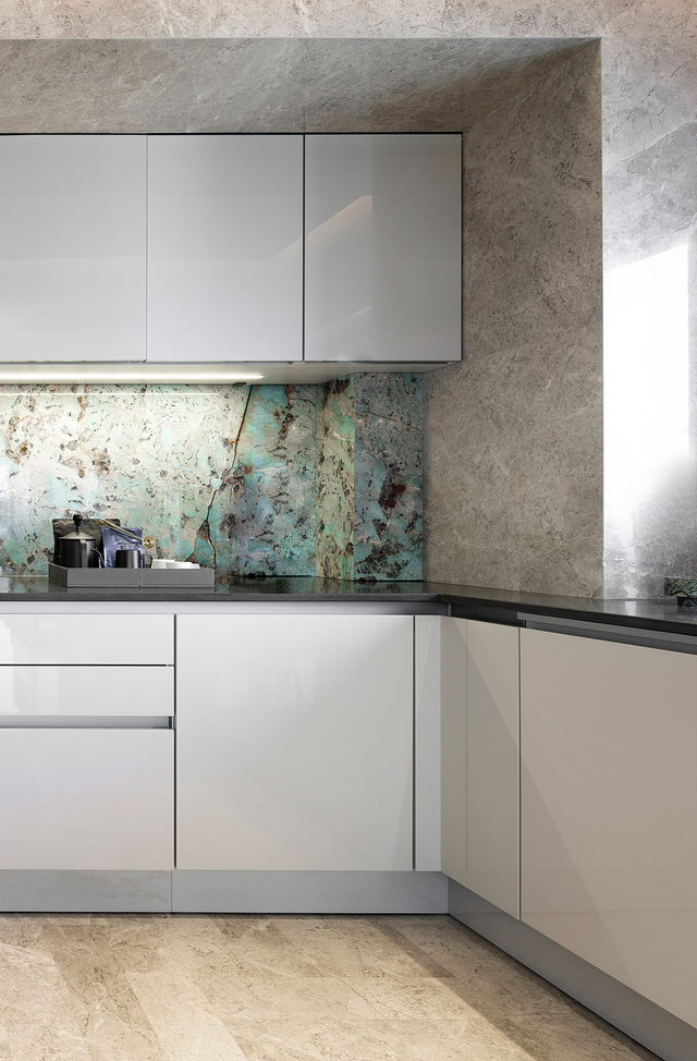 从走廊延续到厨房的亚马逊绿大理石联配简练的厨房橱柜,凝练出优雅的空间氛围,成为此套户型标志色。