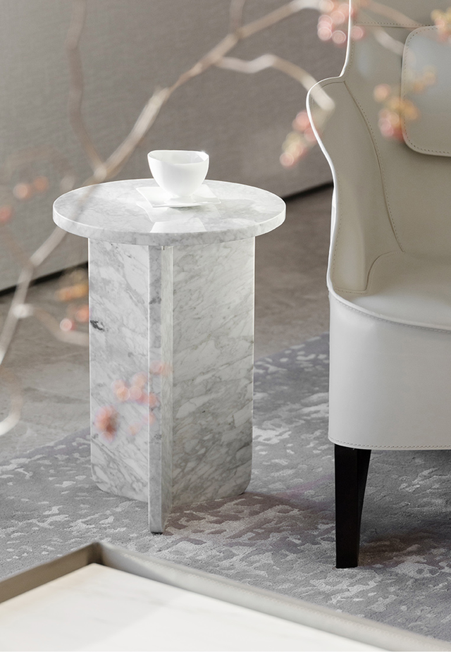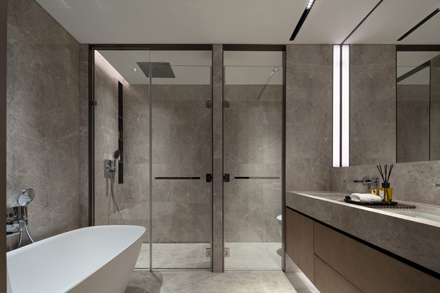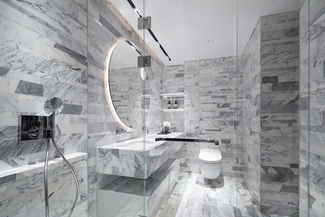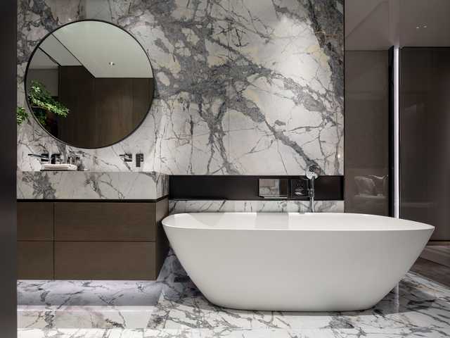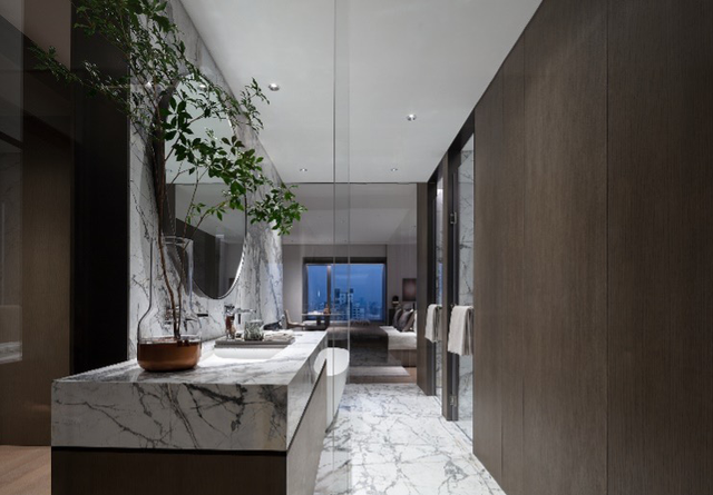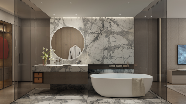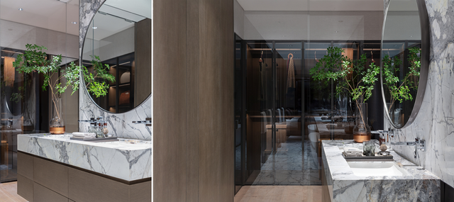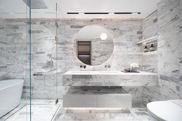 大尺度主卫以奢华的意大利臻白拼接板,不间断地从墙面延伸至台面和地面,优雅而自信地呈现出居者独特的自我意识。