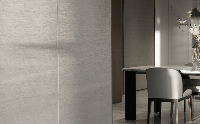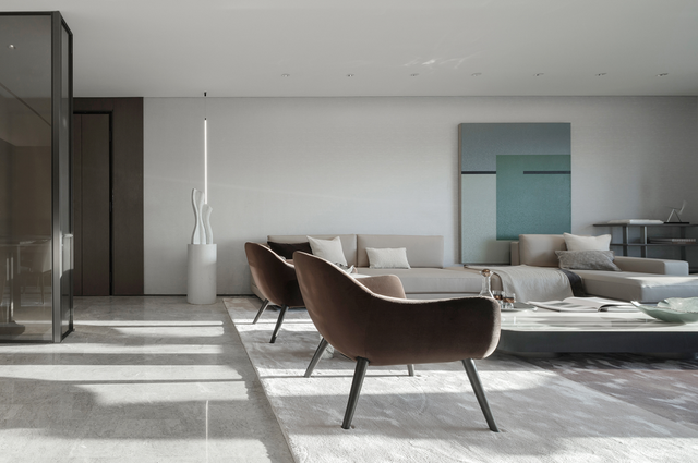 在C户型的内部,设计师将社会精英的气质寓于沉稳冷静中的肌理表达,将现代生活融合了东方文化特有的留白。柔和的赭色、砖色、绿灰色和铜色、绒面革、大理石、Villeroy&Boch陶瓷、ITLAS木材等组成的平静调色板和强烈的几何线条形成鲜明对比,为每个空间增添了视觉质感,糅炼出宁静端雅的空间气质。