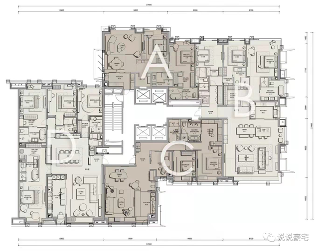 D户型拥有4个各自相对独立的套房,其中主卧的面积配置更加大手笔做出了豪华酒店的房间布局,丰富居者体验的同时可以很好地留出家庭每个成员的私密需求。