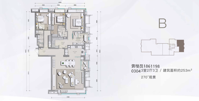 2、B户型面积是253平,总价:3500万-4000万。