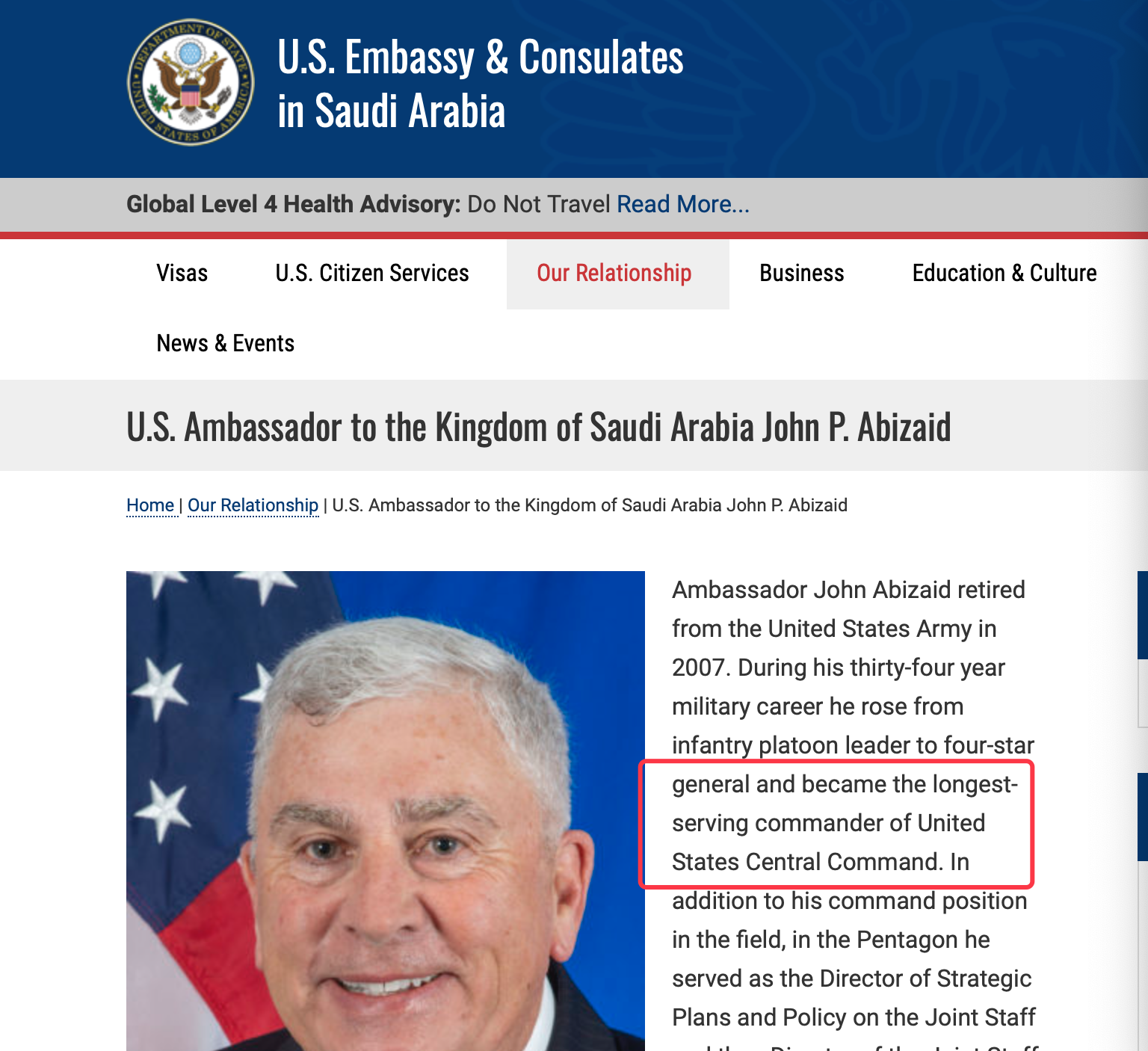 哪怕和哈里斯同级的高管也有前美国中央司令部司令,John P. Abizaid,在退役后被提名并成为美国驻沙特阿拉伯大使。
