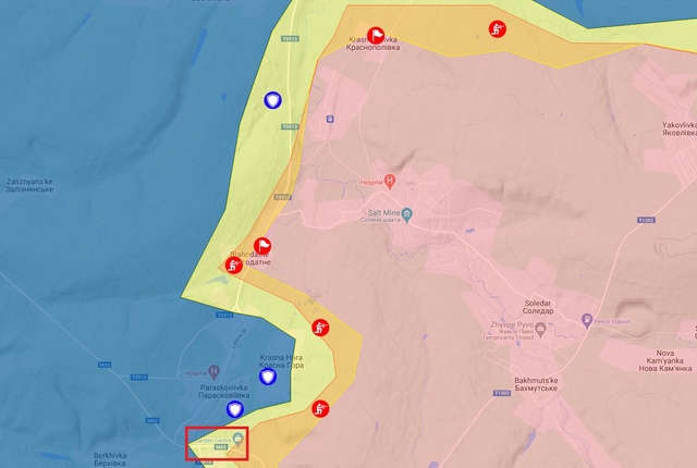 在巴赫穆特的北部,目前已经确认,俄军控制了Blahodatne以及苏勒达尔以北的Krasnopolivka。Paraskoviivka(下图红框)以南的十字路口,以及Krasna Hora仍处于争夺之中,被占纯属谣言。