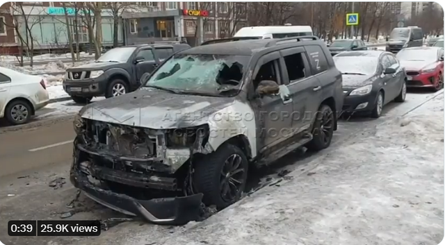 莫斯科反战日常,一辆有Z字标记的车辆在莫斯科被燃毁。