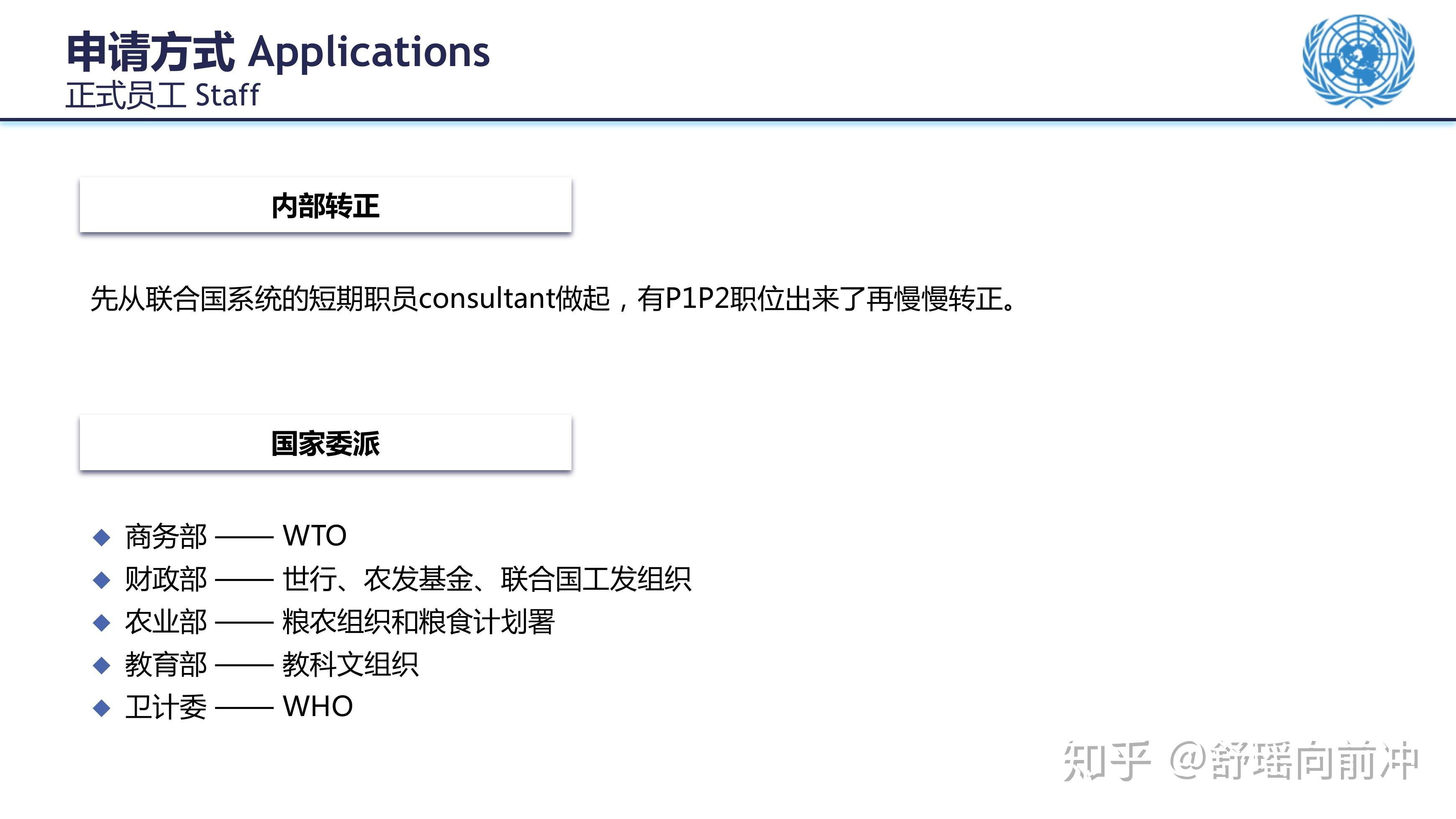 在国家部委做到一定级别(一般是处级及以上级别)再去竞聘 UN 的职位。