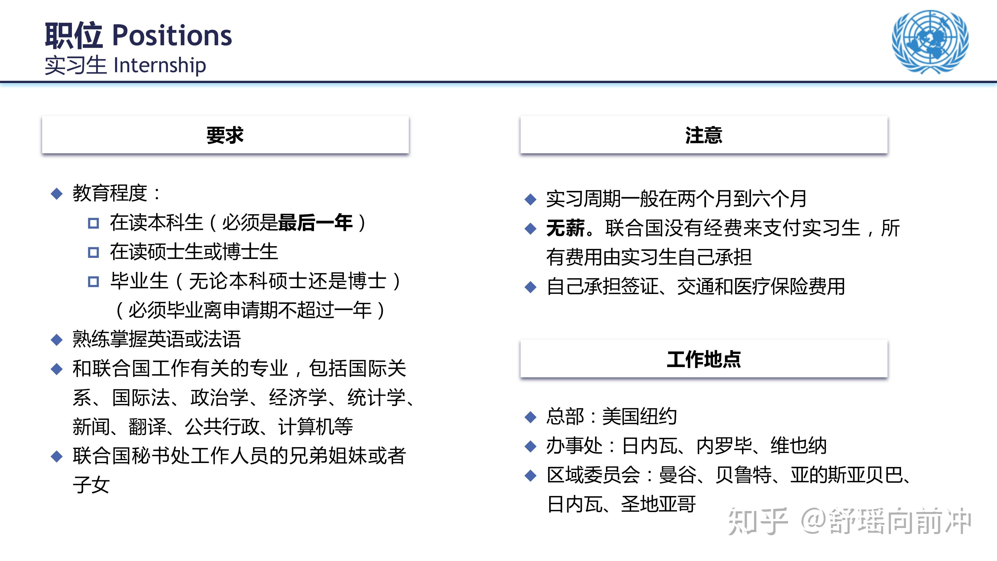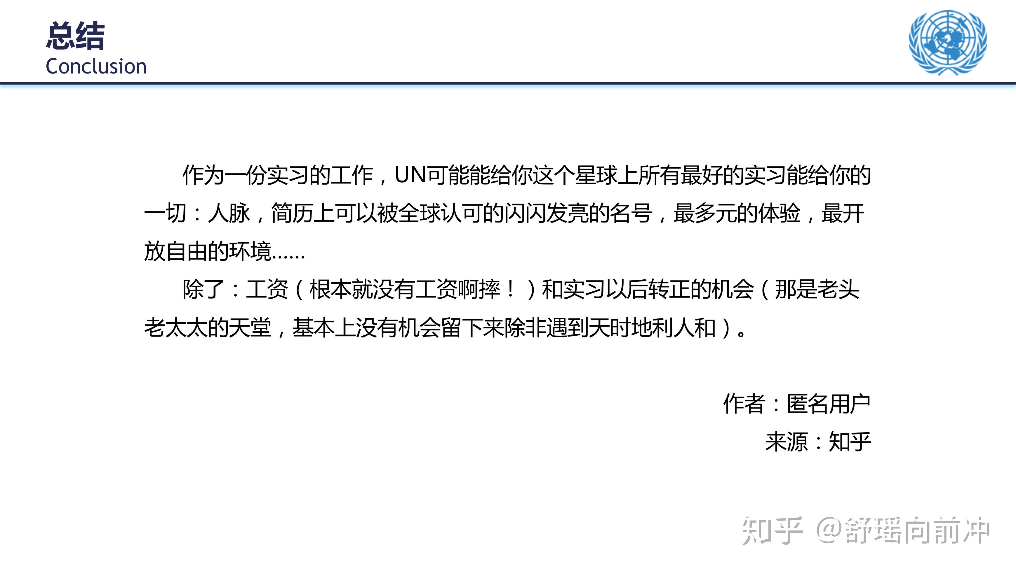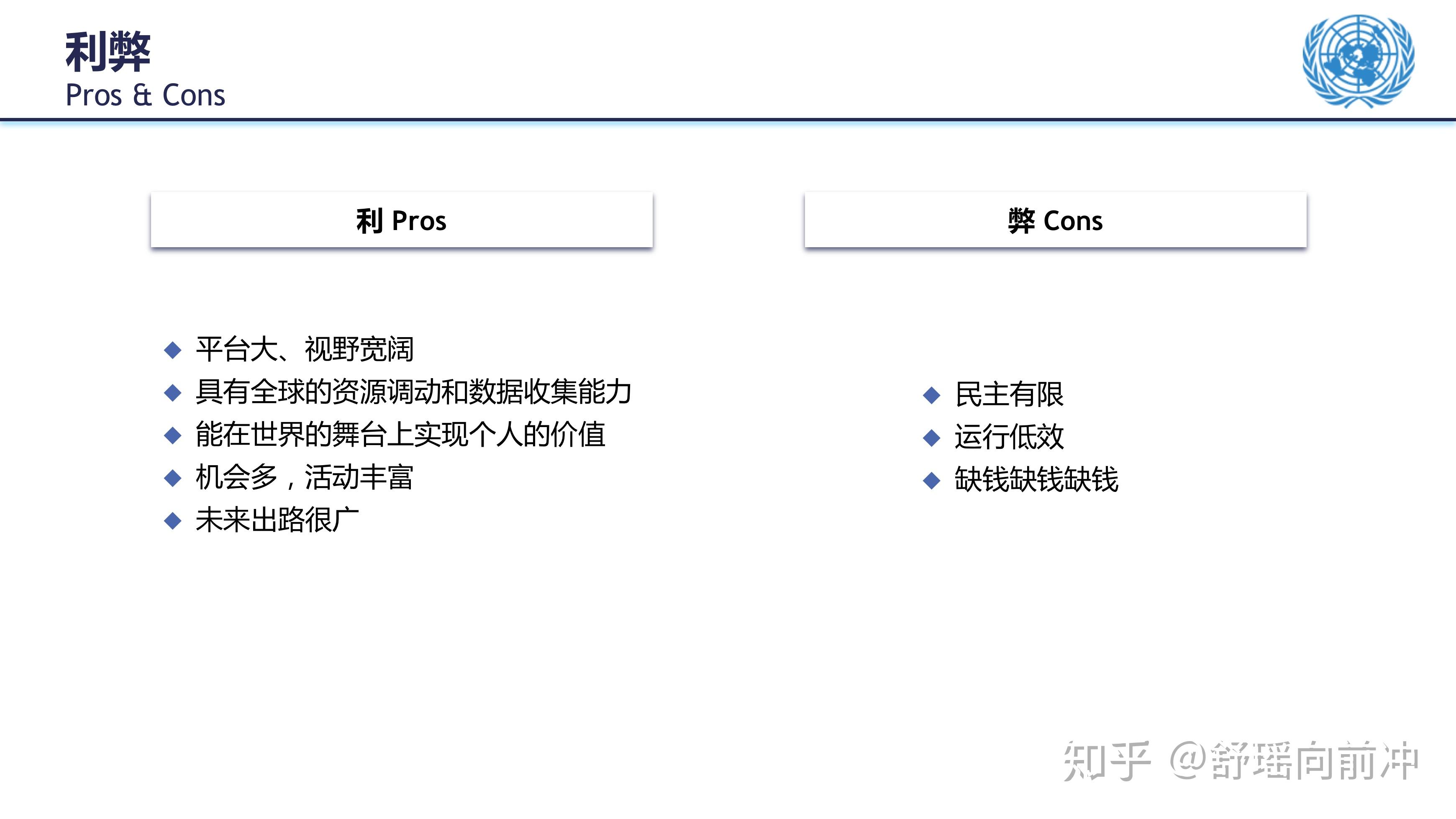 机会多,各专门机构共享资源,活动丰富,未来即使不在 UN 工作,出路也很广。