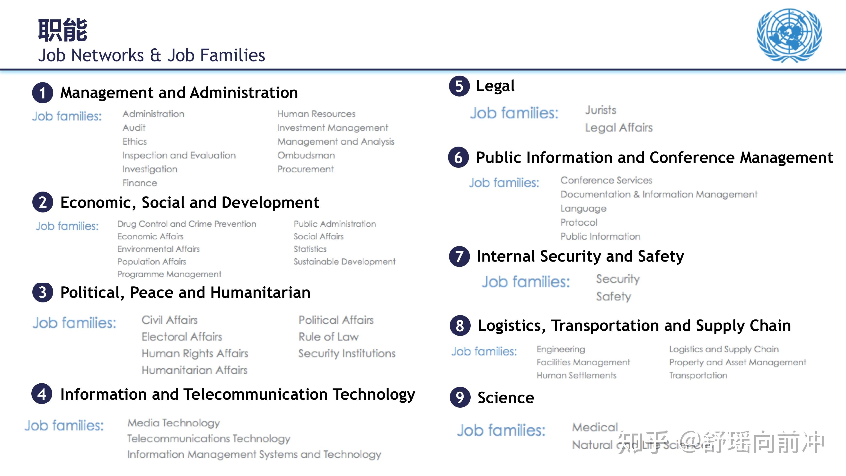 联合国对员工的职能有详尽的划分,分成九大类,即九个