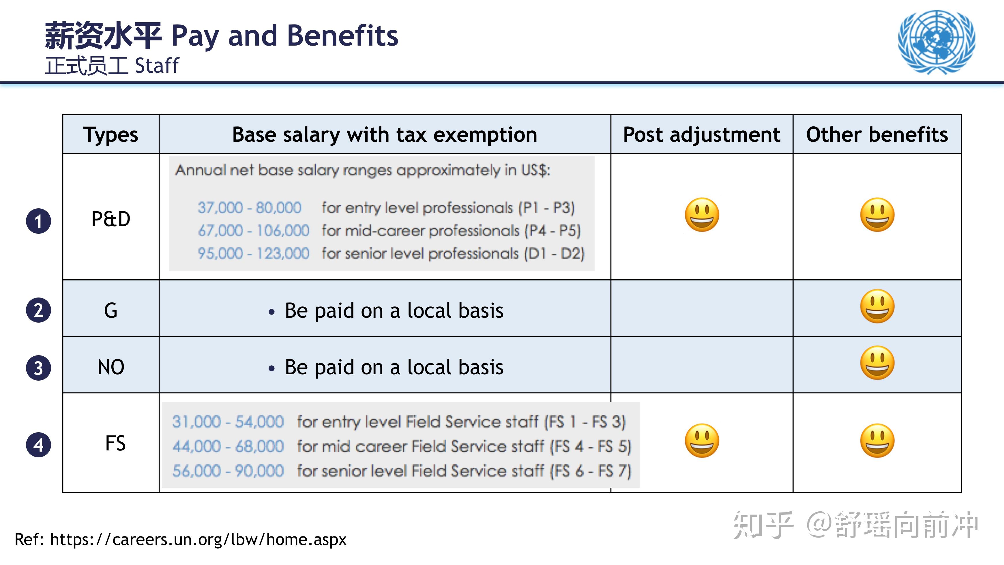调整工资的算法是在基本工资的基础上乘一个乘数,这个乘数根据地区物价和汇率决定。假设在内罗毕乘数是0.6,那么 P 类就能获得1.6倍的基本工资。很吸引人吧~
