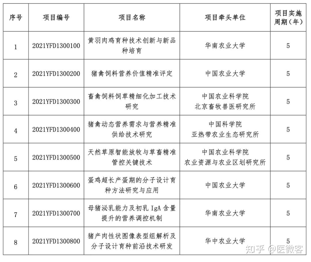国家重点研发计划“畜禽新品种培育与现代牧场科技创新”重点专项 2021 年度常规项目和青年科学家项目拟立项项目安排公示清单